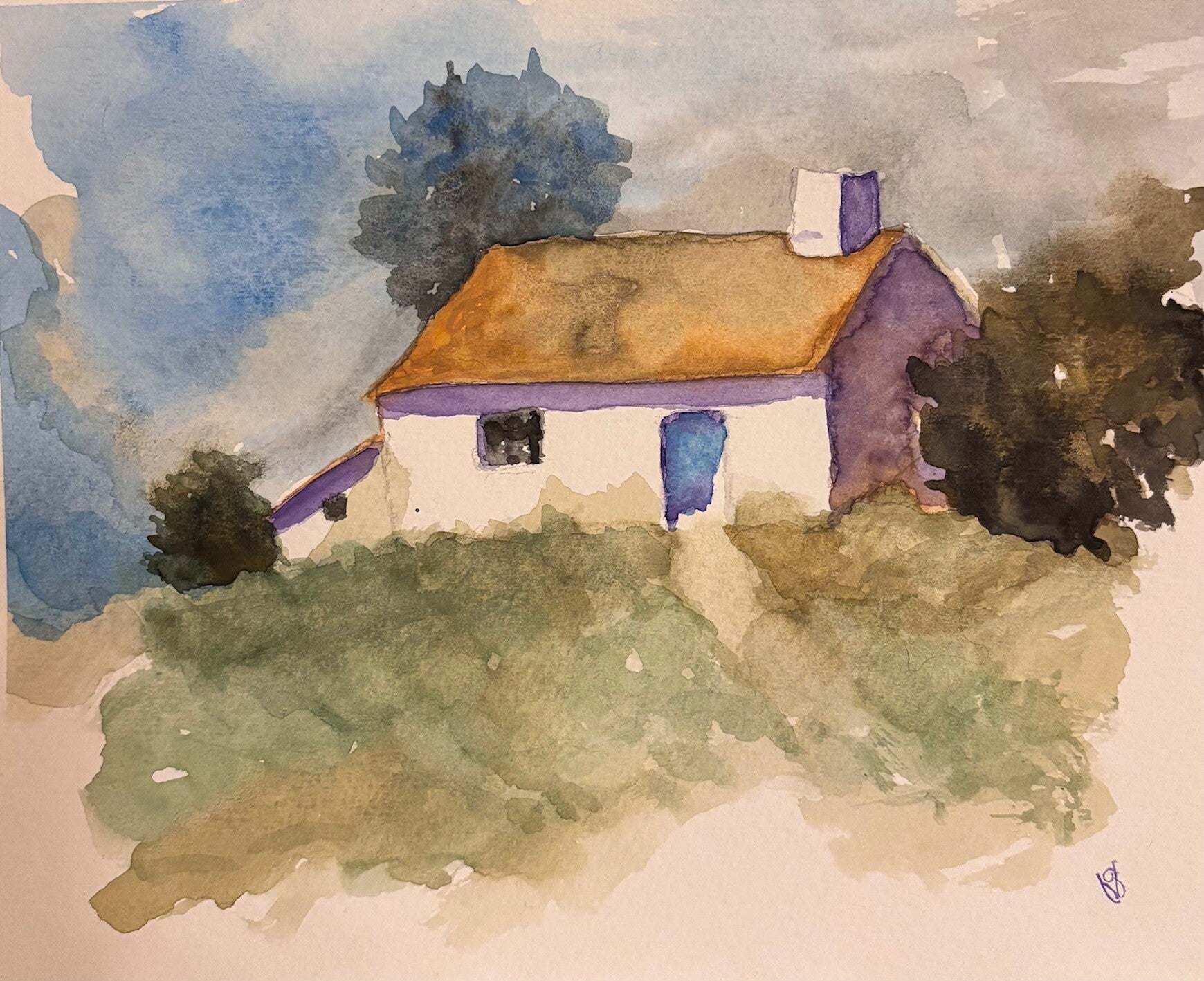 "The Sanctuary" is still home. The roof has been repaired, and the chimney still holds a nice fire safely during the chilly evenings and mornings. A steaming hot cup of coffee, and freshly baked croissants begin each day. The pathway is still worn that leads to the front door. Visitors are always welcome, and made to feel at home once inside. An evening meal of something hot on the stove is always inviting and appreciated. "The Sanctuary" is home to one, but a destination for many and filled with memories and love. Hand painted original watercolor. All paintings are matted and arrive in a stock frame to protect them during shipping.