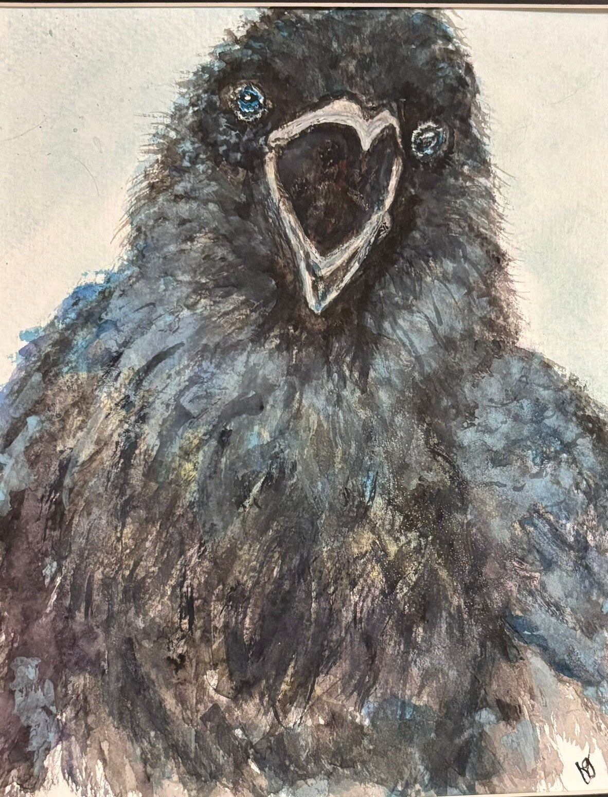 We all know a "story teller". Their voices can be loud and boisterous, but they are usually very entertaining. Highly intelligent, this Corvid's cry may be a warning to his family that danger is near. No matter the warning or communication he needs to share, he will make his voice be heard in a loud and demanding voice. Paintings arrive with temporary matting and a stock frame to protect them during shipping.